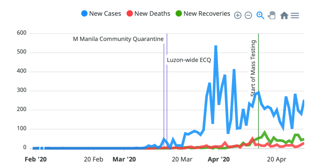 I am sure most of us were expecting that with the initial 30 days ECQ, the number of cases – admission and deaths – would have gone down, and see more recoveries. But the first 30 days simply showed dismal numbers. Plotted on a linear graph, Figure 1 below shows the see-saw of daily data being reported.