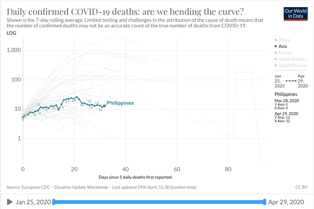 Figure 3 transforms the linear data into a logarithmic scale. It reported its 5th death on March 28. On the 20th day up to the publication of this article, it has remained above 10. Those numbers need to be “bent” in order to see the impact of the ECQ on death rates due to SARS-CoV-2.