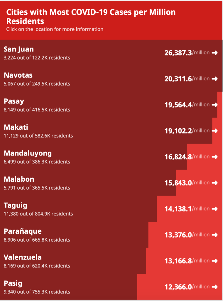 That’s because while Quezon City has more than 31,000 cases in its pocket, with a population of close to 3,000,000, its per capita is only 10,819/million population. The same story is seen in the City of Manila where in spite of the more than 21,000 cases to date, its population of almost 1.8M people make their per capita 12,000/million population.