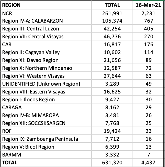 With today’s case load, the NCR continued to lead with 2,231 new cases (more than 50%) in spite of the lower total cases for the day. Five other regions recorded triple digits: CALABARZON, Central Luzon, Central Visayas, CAR and Cagayan Valley. Remarkably, Central Visayas moves down to fourth spot after almost two months in second rank.