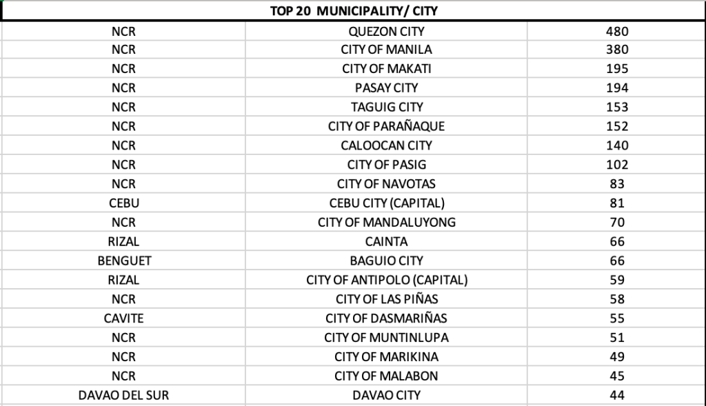 Eight LGUs in the NCR had triple digits with Quezon City reporting more than 20 percent of the total cases. Manila, Makati, Pasay City, Taguig, Parañaque, Caloocan and Pasig had more than 100 cases each. Fourteen of the 17 LGUs were in the top twenty cities for the country. Of the top ten cities with most cases in the country today, ALL were from Mega Manila.