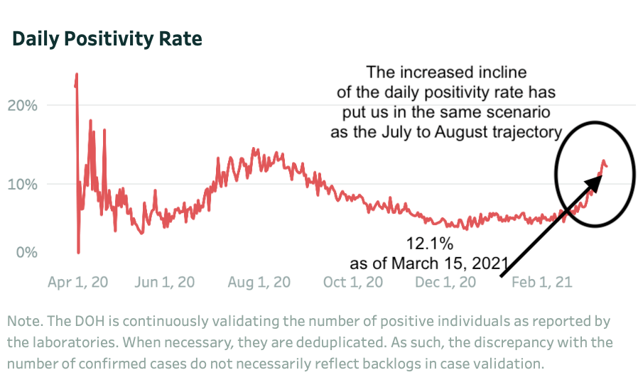 The Health Agency’s website today shows the steep incline in cases for the week March 4-10, 2021. This, in spite of the fact that the data is based on Date of Onset of Illness. Definitely, this storm is far from over and as the vaccine program of the government is being rolled out to the frontliners, the government needs to seriously consider placing containment policies on mobility in the next few weeks in order to avert this surge.