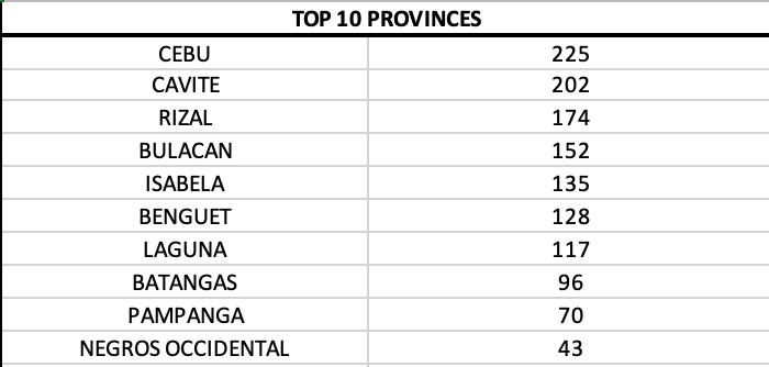 On a provincial level, Cebu was back on top but with significantly lower cases. Cavite, Rizal, Bulacan, Isabela, Benguet, and Laguna reported triple digits.