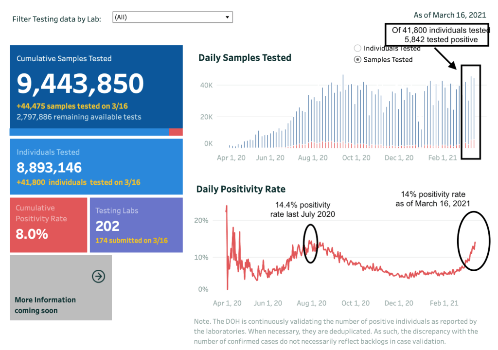 The daily positivity rate for March 16, 2021 was almost similar to the July 30, 2020 trend. The difference? We’re running 10,000-15,000 more samples for testing in this surge compared to the last surge. Which implies that we need to be testing more. And with more than 220 testing centers now compared to the 150 testing centers last July 2020, there is no reason that we shouldn’t be testing more and doing more aggressive contact tracing.