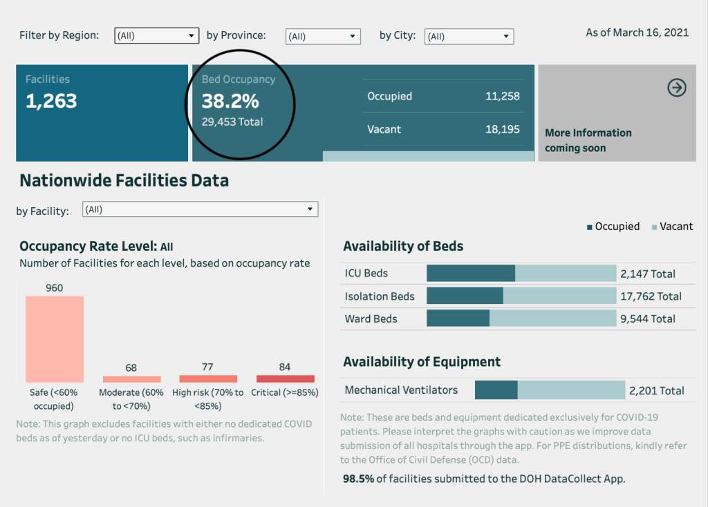 The Health Agency notes in the website (and in their press release) that the hospital capacity of the country is still way below the critical level. This, however, is not an accurate picture of how the pandemic playbook is affecting health systems in areas with higher cases. There are over 1,260 facilities spread throughout the 7,640 islands of the country. Only five regions are currently inundated with cases, with NCR seeing quadruple digits daily.