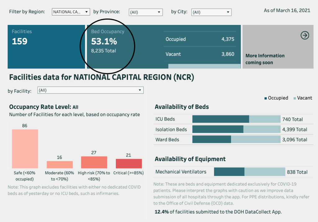 Health capacity dramatically changes when you drill down to the specific regions. In the National Capital Region where the daily cases far exceed the daily cases of other countries, the occupancy rate is past 53%.