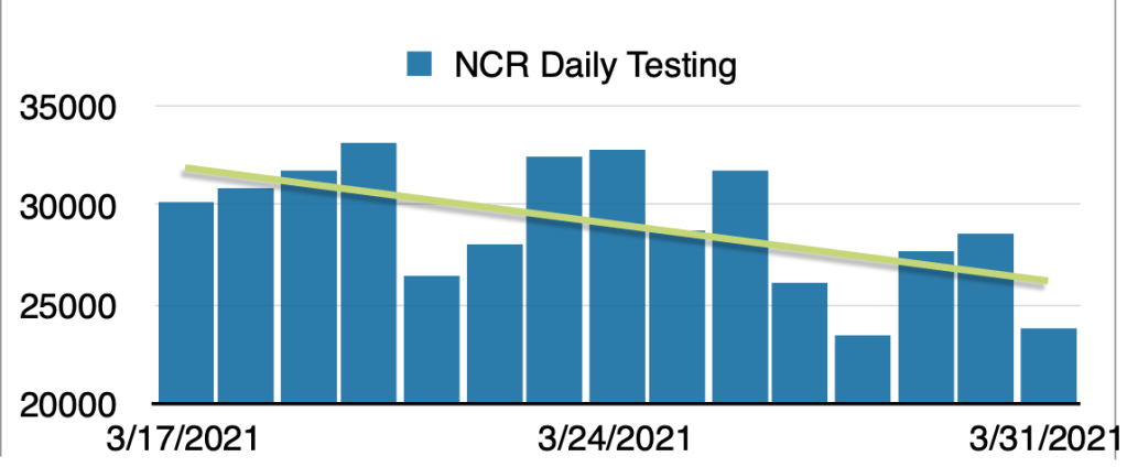 The ECQ has a greater effect in reducing the reproduction number compared to the GCQ. The average number of tests per day in the NCR from March 28-31 was 25,880, a 12 percent decline in tests compared to the daily average from March 21-27. The problem is that with a high positivity rate of 23 percent in the NCR, there is a need to further scale up PCR testing to be able to keep up with the surge in new COVID-19 cases.