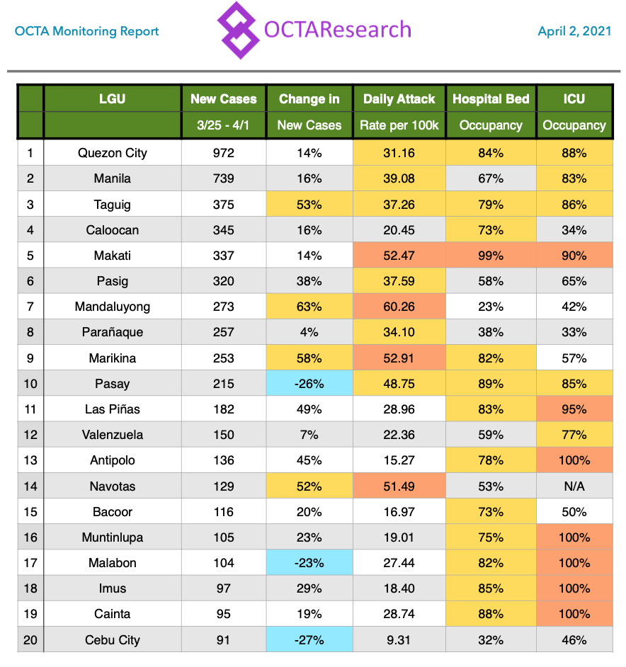 Philippine COVID-19 UPDATE, OCTA Monitoring Report, April 01, 2021