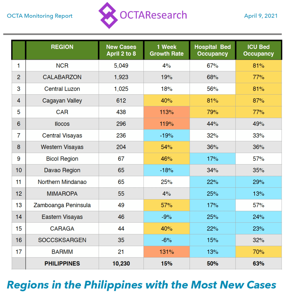 The table below shows the regions in the Philippines with the most new cases for the week April 2-8, 2021, the growth rate of cases in the week, hospital bed occupancy and ICU bed occupancy.