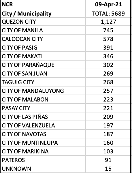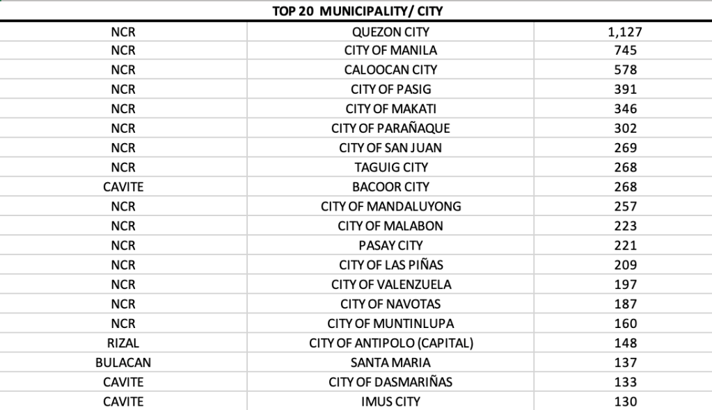 - Cavite for the first time saw quadruple digits with 1,005 new cases followed by Bulacan (632) and Rizal (541).