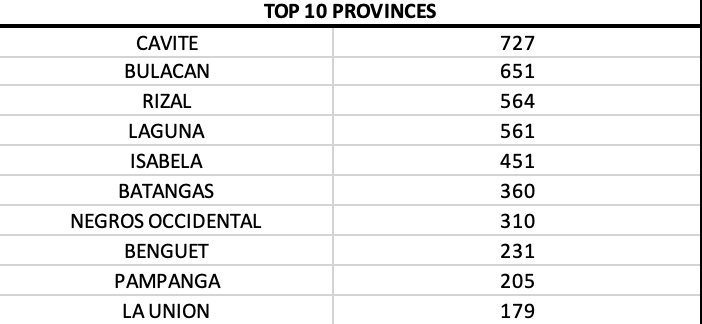 At a provincial level, Cavite, Bulacan, Rizal and Laguna report more than 500 cases today.