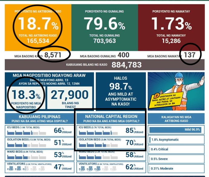 There were 137 new deaths reported. Positivity rate is at 18.3 percent (appreciably lower than the previous days) but the hospitals are inundated with patients where ICUs are now filled to the brim in many public and private hospitals in the National Capital Region. Isolation facilities have been added in some cities, but not enough for the rising cases in those localities.