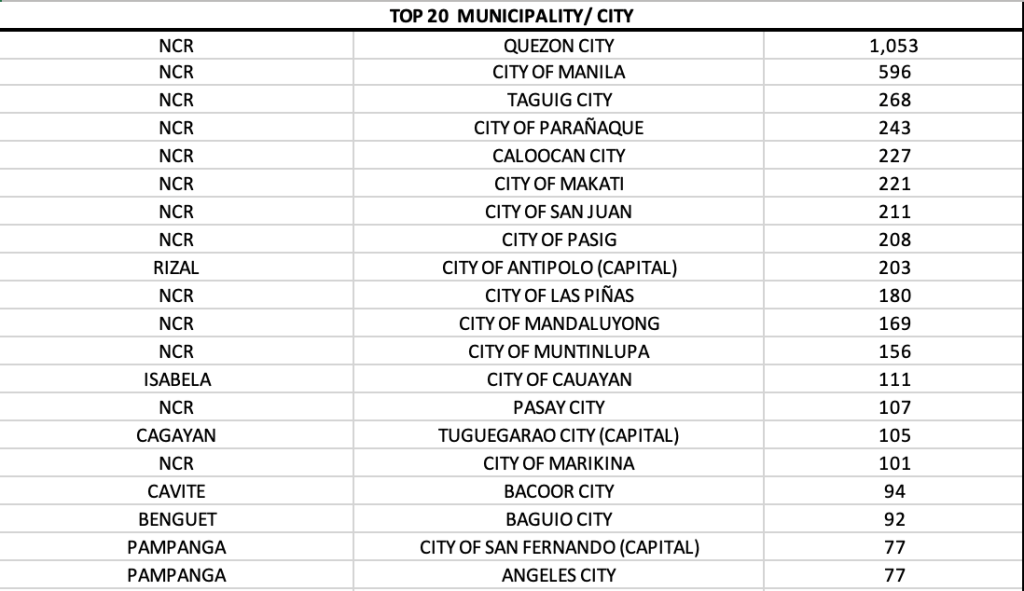 On a provincial level, Cavite continued to lead with 539 cases followed by Rizal with 511. Pampanga, which is in GCQ status has 462 cases today, higher than erstwhile leader Bulacan that reported 397 cases which is in MECQ status.