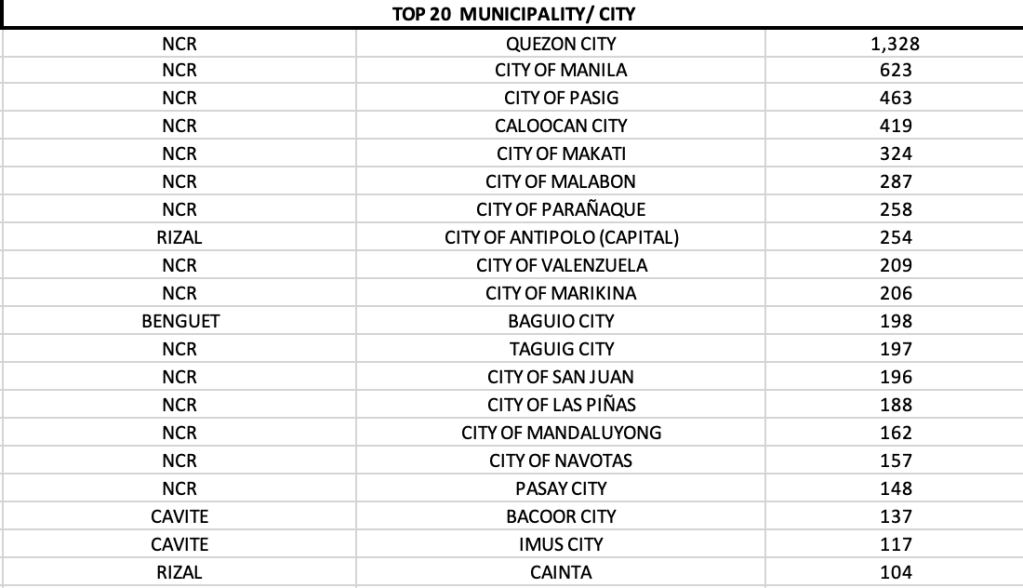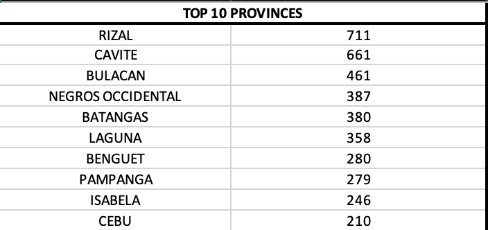 On a provincial level, Rizal overtook Cavite for the top spot. Bulacan was in third with 461 cases. All top ten reported more than 200 cases.