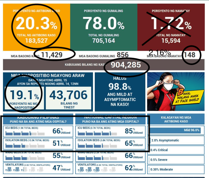 The case fatality ratio is NOT 1.72 percent. While the Health Agency arrives at this number by computing the number of deaths divided by the number of cases. A better way to compute for CFR is to use the formula [deaths/(deaths + recoveries)] x 100 = CFR. This latter formula mitigates the bias due to delays in case resolution during an ongoing outbreak by restricting the analysis to resolved cases. This is particularly important at this time because the number of active cases is now more than 20 percent. Hence the denominator cannot be the total number of cases as it is presumptuous that the active cases will all recover. The denominator that should be used should be the deaths plus the cases that have recovered. These are the resolved cases. While this method does not eliminate all biases related to delayed reporting, it is a better formula for computing deaths due to COVID-19, as we still do not know the outcome of the active cases. [For further information on this, kindly refer to the link https://www.who.int/news-room/commentaries/detail/estimating-mortality-from-covid-19 .]