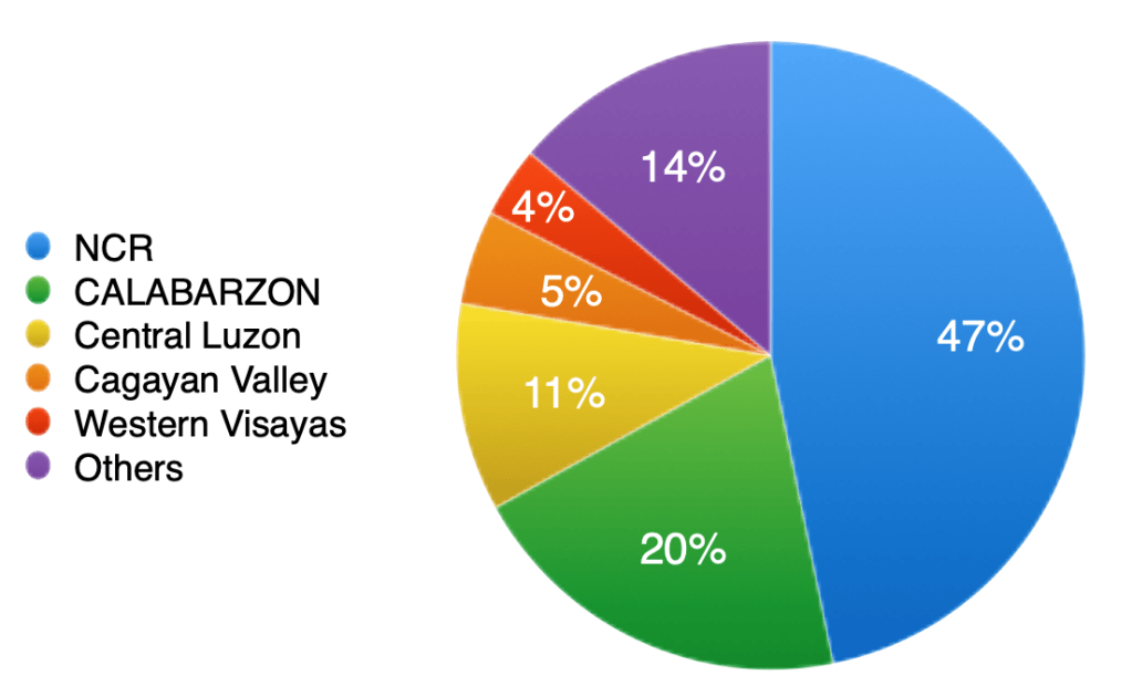 Mega Manila accounted for 47 percent of new reported COVID-19 cases over the past week. The rest were divided as follows: CALABARZON 20 %, Central Luzon 11%, Cagayan Valley 5% and Western Visayas 4%. The one week growth rate of new cases in CALABARZON and Bulacan was 14 percent, while the one week growth rate in Western Visayas was highest at 97%. Cagayan Valley had a decline in the growth rate of -14%.