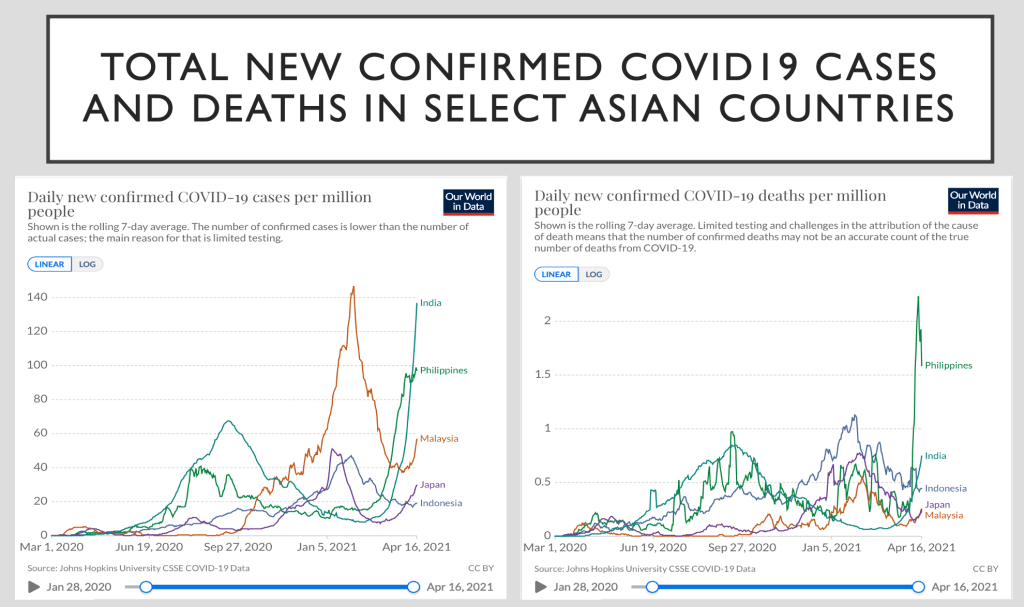 While it is a fact that the world is seeing a rise in new cases, the infographic below provides an overview of the current situation in select Asian countries, with Indonesia seeing declining trends compared to the rest. The daily new confirmed COVID-19 deaths per million population has also astoundingly increased for the Philippines making the case for using deaths/cases an implausible estimation for case fatality ration.