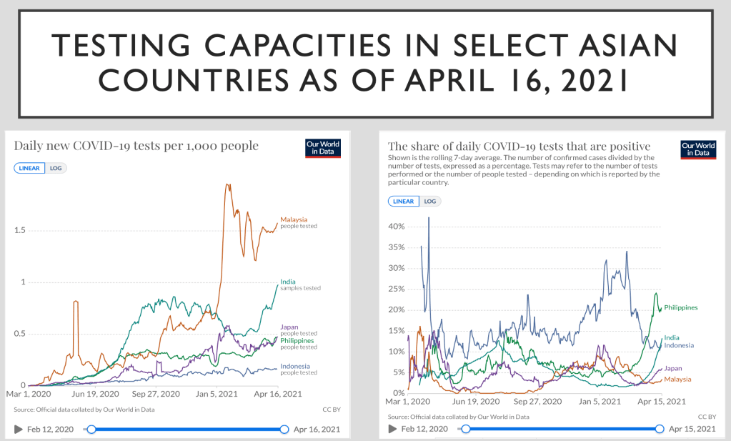 Testing capacity among the same select Asian countries above show that while the Philippines is testing more people per 1,000 population, the share of the daily COVID-19 tests that are positive are highest for the country with a current positivity rate averaging 20 percent (1 in every 5 tested will likely test positive).