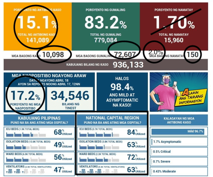 The Health Agency reports 10,098 new cases and in the weekly recovery haul, 72,607 recovered this week (based most likely on a time-based recovery status). This leaves 15.1 percent active cases or 141,089 who have still neither recovered or resulted in demise. This brings the case fatality ratio based on outcomes to 2.0 percent, with the DOH reporting 150 new deaths.