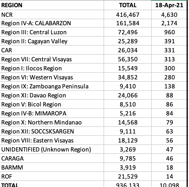 With a 7-day moving average of 10,406 new daily cases for the country, the Philippines had 72,842 total cases for the week April 11-17, 2021, and 1,071 new deaths for the same week (7-day average of 153 deaths/day).
