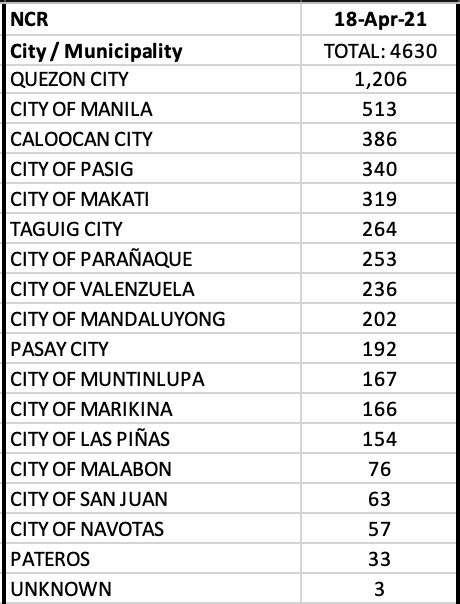 In Mega Manila, Quezon City led the haul with 26 percent of the total cases. Manila had 513 new cases. Eleven other cities had more than 100 cases. Thirteen of the 17 LGUs in NCR were among the top twenty cities with most cases for the day.