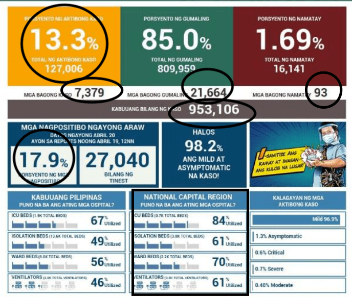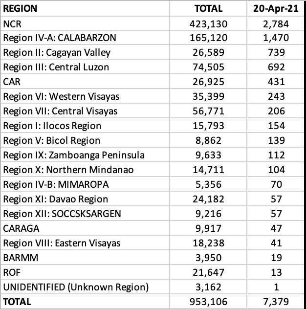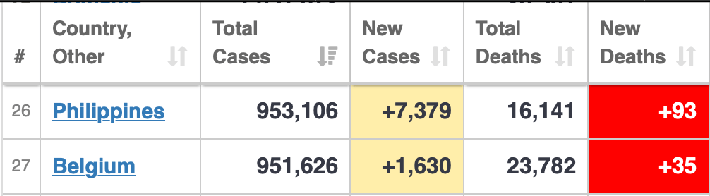 It’s a Tuesday, and as expected, the new cases reported are lower at 7,379, pushing our total cases past 950,000 and the Philippines displacing Belgium for the 26th rank in the world. We remain on track to the 1 Million mark before the end of April and there is no stopping the country from reaching this milestone.