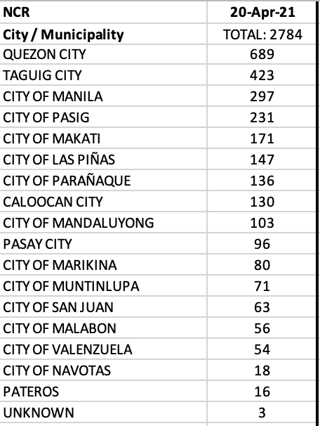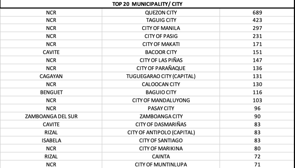 In Mega Manila, Quezon City continued to lead but Taguig overtook the City of Manila for most cases. Eight cities reported only double digits. Twelve of the 17 LGUs in NCR were among the top 20 cities with most cases.