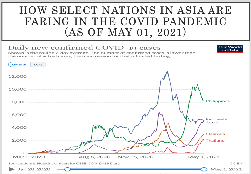 But the Philippines is not the only Asian nation that is currently battling surges during the pandemic. Indonesia has been seeing a significant decline since March 2021 and has seemed to plateau at 5,000 for the past month. The Philippines saw its second surge in March but has seen lower cases in the past ten days. Japan is battling its third surge, while Malaysia and Thailand are working at addressing their second surge.