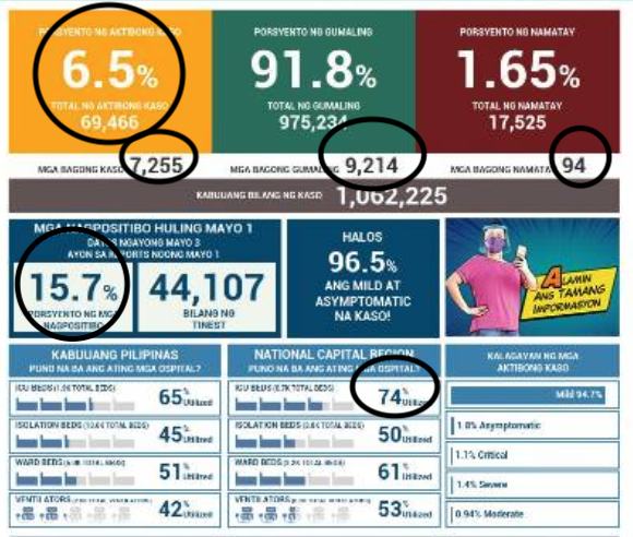 With 9,214 recoveries announced, the active cases are a bit shy of 70,000 (6.5%). The positivity rate for May 1, 2021, reported today is at 15.7%. Utilization for Intensive Care Beds are up at 74 percent.