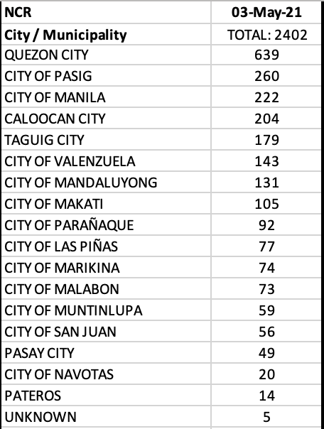 Quezon City continued to account for the majority of cases in the NCR with 639 or 27 percent of the total cases. Twelve of 17 LGUs were among the top twenty cities with most cases.