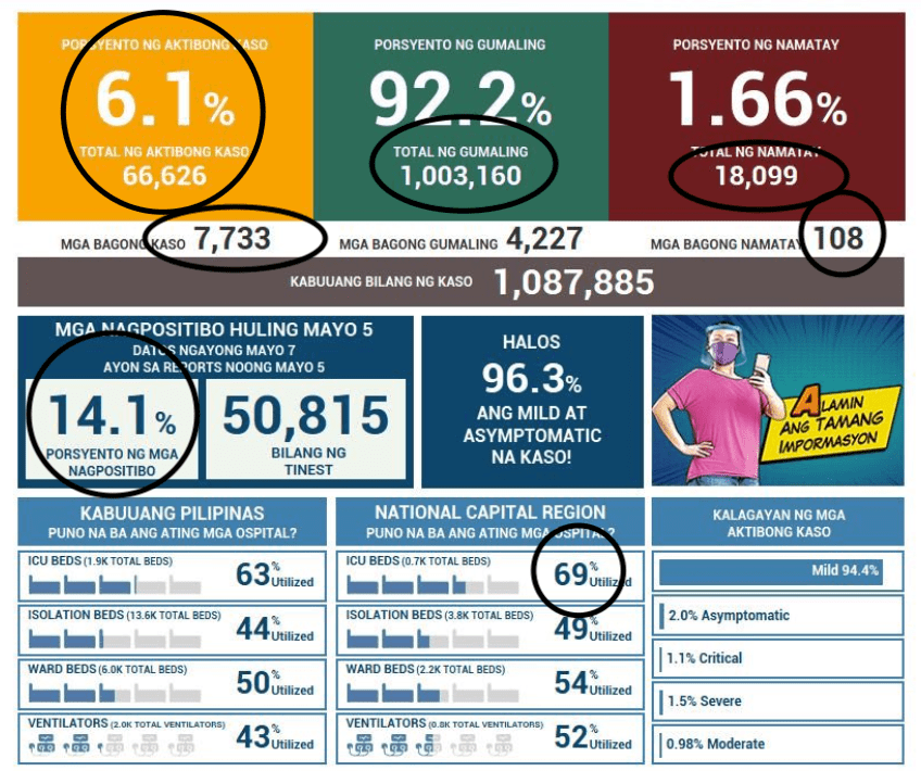 As of today, the Philippines has had more than 1 million recoveries from the more than 1.087 million total cases. The cup half empty is that with 108 new deaths, we have now passed the 18,000 deaths mark as well. The case fatality ratio based on outcomes (there were fewer recoveries than cases today) is slightly up at 1.77 percent. And while the Department of Health reports improvement in ICU capacity, which is down to 69% filled up in Mega Manila, this does not seem to translate to the actual occupancies in various hospitals in the National Capital Region.