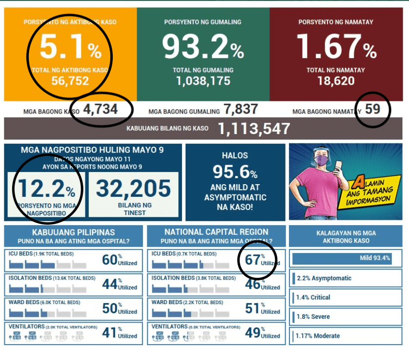 For the first time in quite awhile, the total cases in the country dips to less than 5,000 with the Health Agency reporting 4,734 new cases. The positivity rate for May 9 is also down to 12.2% and this continued decline is welcome news as the sad news of the Indian variants being reported in 2 Filipino overseas foreign workers.