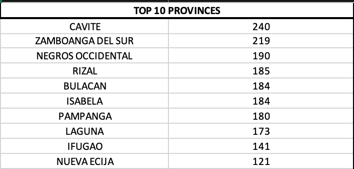 Cavite, Zamboanga del Sur, and Negros Occidental led the haul on a provincial level.
