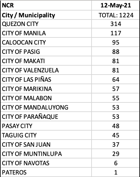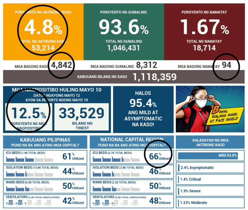 With more than 8300 recoveries noted, the active cases are a little above 53,000 or 4.8% of the total cases in the country. Positivity rate is at 12.5% for May 10, reported today May 12. With 94 new deaths, this brings the case fatality ratio for outcomes (recoveries and deaths) steady at 1.76%.