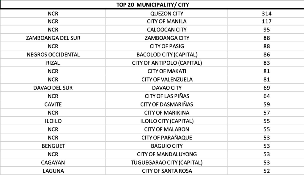 In NCR, Quezon City and the City of Manila were the only cities that saw triple digits. While the rest of the LGUs had double digits, note that eleven of 17 LGUs were among the top twenty cities with most cases for the day.