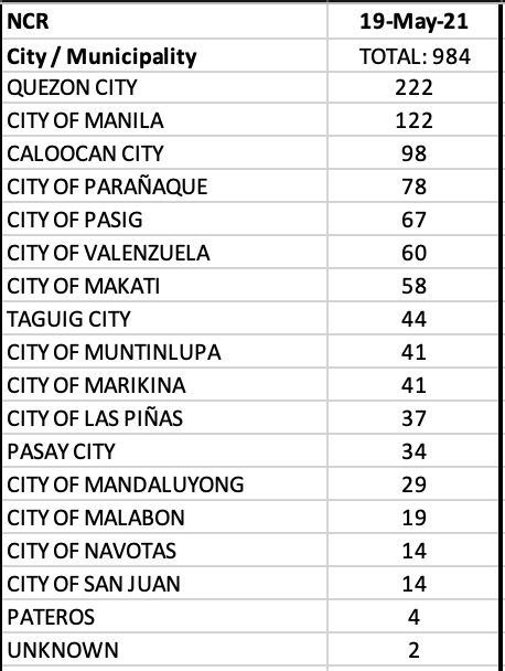 In NCR, it is Quezon City that continued to lead both nationally and on a city level with 222 new cases. Eight of 17 LGUS in NCR are among the top twenty cities with most cases.