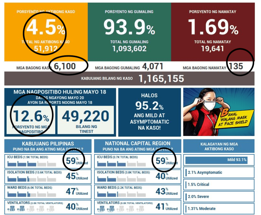 With close to 50,000 tests done on May 18, 2021, and a positivity rate of 12.6% for the country, the Health Agency reports 6,100 new cases for the day. And because there were less recoveries than cases, the active cases are up at more than 50,000 again (4.5%) as the NCR sees a slight bump in utilization of ICU beds to 59% (from a previous low of 56%).