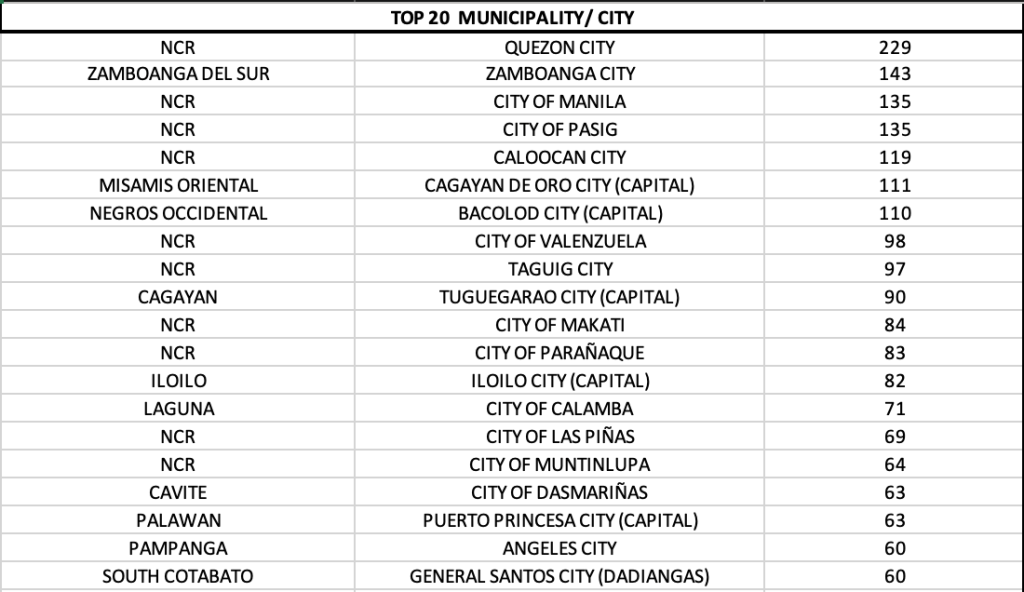Ten of 17 LGUs in NCR continue to be among the top 20 cities with most cases. Quezon City, Manila, Pasig and Caloocan City report triple digits.