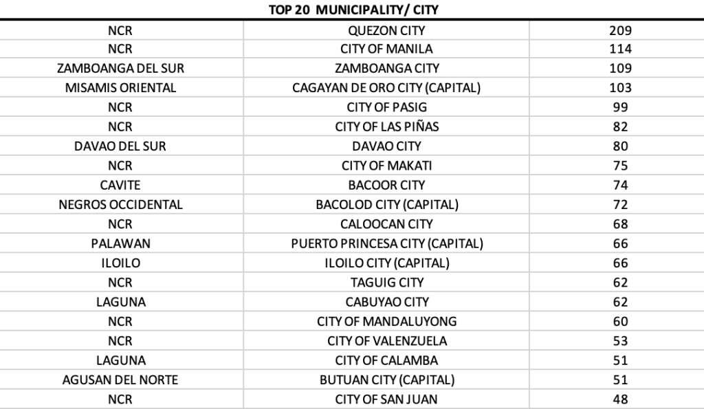 In the National Capital Region, Quezon City and Manila continued to lead the haul with triple digits. And on a national level, ten of 17 cities from NCR are among the top twenty cities with most cases in the county. The other half of the top cities outside of NCR include: Zamboanga City, Cagayan de Oro, Davao City, Bacoor City (Cavite) and Bacolod City (Negros Occidental), that are in the top ten.