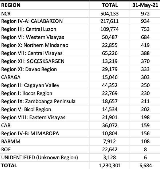 And with 107 new deaths, the case fatality ratio for outcomes remains steady at 1.78% as the Philippines ends the month of May 2021 with 1.23M total cases since the start of the pandemic.