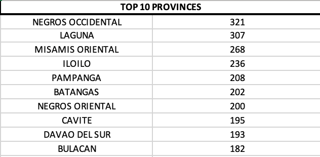On a provincial level, Negros Occidental took the lead over Laguna.