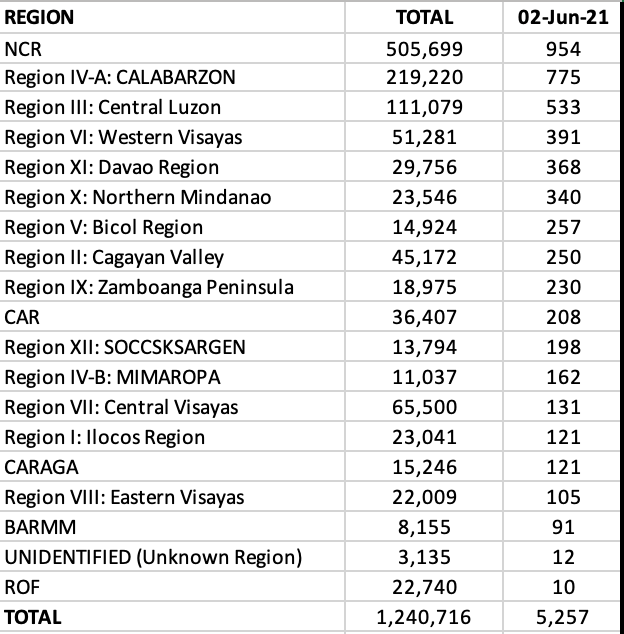 The NCR takes back the lead with a little less than 1,000 new cases or 18.2% of the total cases for the day, followed by CALABARZON and Central Luzon. The irony is, that even on a day like Wednesday where the new cases are lower than the rest of the days of the week (except Tuesdays), all but one region (BARMM) report triple digits.