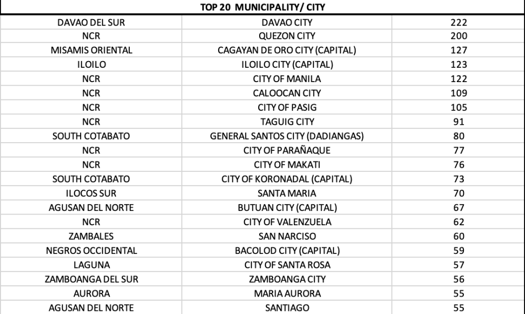 Among the top cities with most cases, it was Davao City that continued to lead in cases followed by Quezon City, Cagayan de Oro and Iloilo City. Three of five cities in the top twenty for the day are cities outside of NCR. Eight of 20 cities from NCR were in the top twenty. Oddly, cities/municipalities that were NEVER in the top twenty have appeared today: Santa Maria (Ilocos Sur), San Narciso (Zambales), Maria Aurora (Aurora), and Santiago (Agusan del Norte).