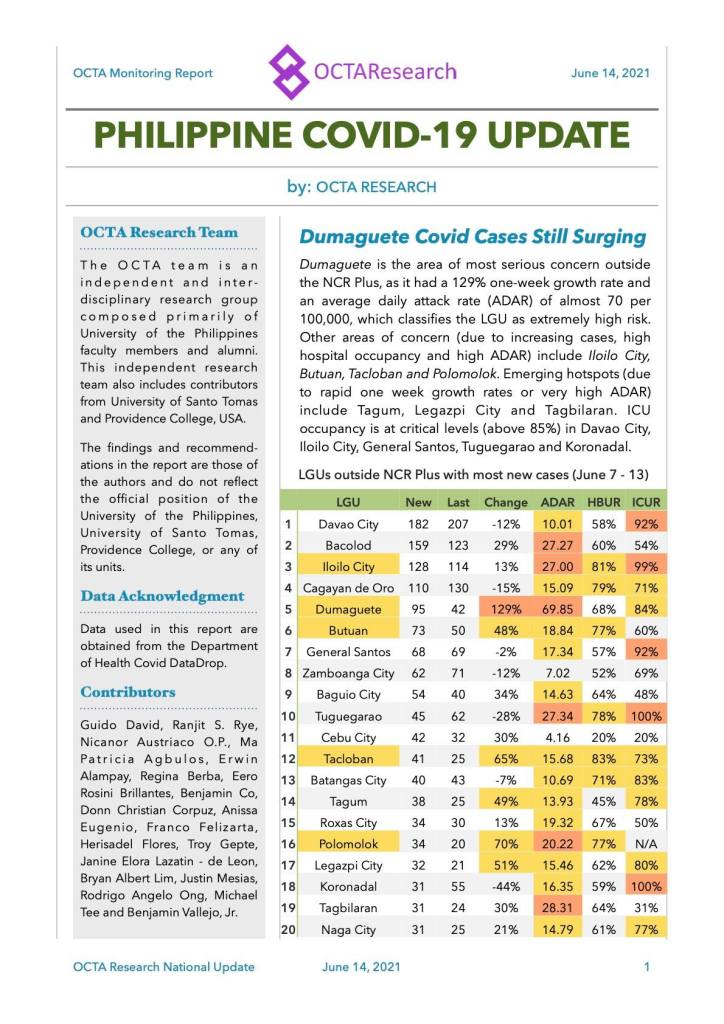 In the latest OCTA Monitoring Report, Dumaguete is the area of most serious concern as its one-week growth rate continues to escalate, its average daily attack rate is almost 70 per 100,000 population and the intensive care unit utilization is at critical levels.