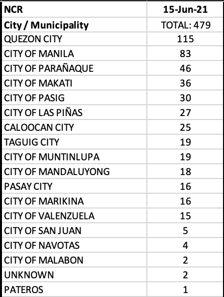 LGUs in NCR continued to report less cases, including Quezon City. But that is because there were 16 testing centers that failed to submit reports. Most of the cases reported outside of NCR plus are late reports. We should expect a rise in cases in the coming days, particularly from the regional areas outside of NCR plus. Only three of 17 LGUs in the NCR made it to the top twenty cities with most cases.