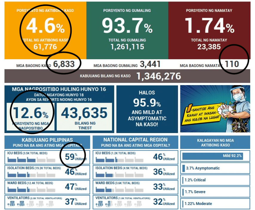 This phenomenon is not an isolated one among LGUs outside of NCR. Bacolod City, Iloilo City, Cagayan de Oro and Dumaguete are also among the top five cities with highest cases. Baguio City saw a 49% increase in cases. Polomok in South Cotabato had the highest increase in cases at 63% for the week of June 11-17. Dumaguete had the highest ADAR (average daily attack rate at 52.21 per 100,000 population) while Iloilo City had the highest Hospital Bed Utilization Rate (HBUR).
