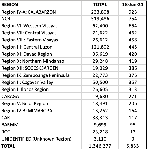 CALABARZON takes back the lead from NCR with close to 1,000 cases. Except for BARMM, all other regions reported triple digit numbers. It was the Visayas that saw a horrible day with Western, Central and Eastern Visayas capping the top five regions from 3rd to 5th ranks.