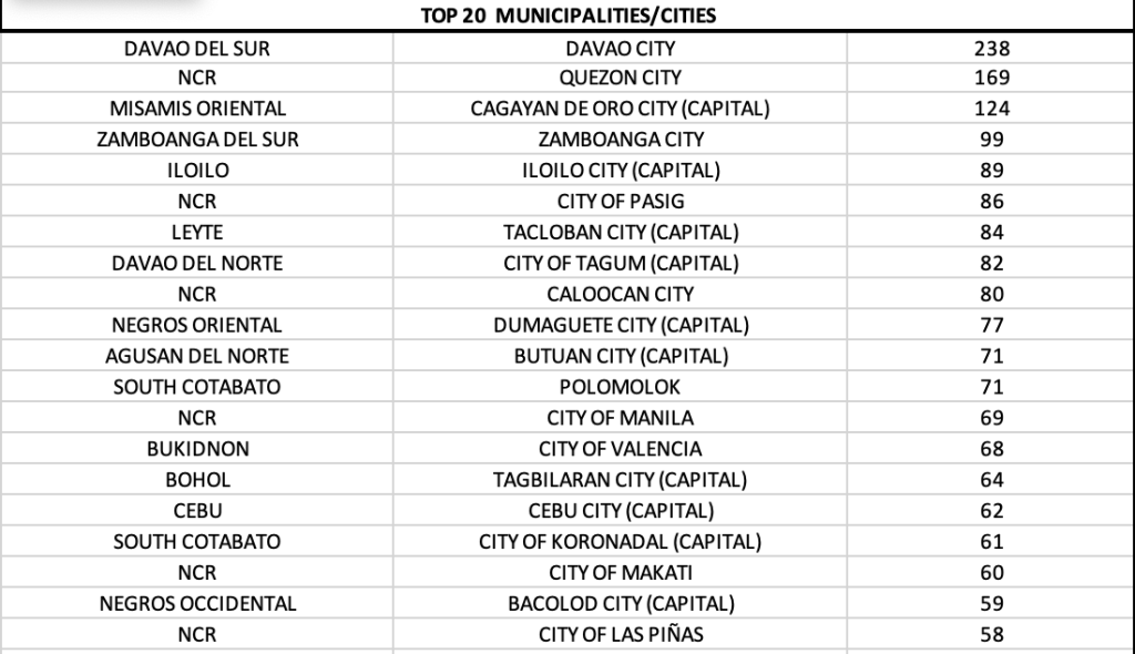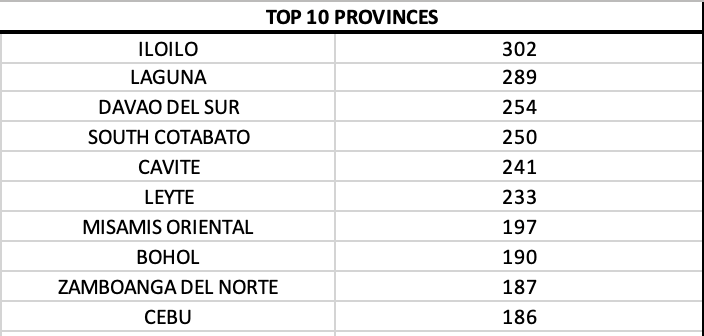 On a provincial level, Iloilo grabbed the lead followed by Laguna and Davao del Sur.