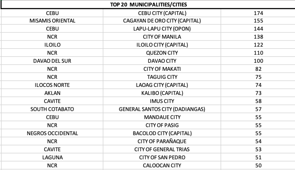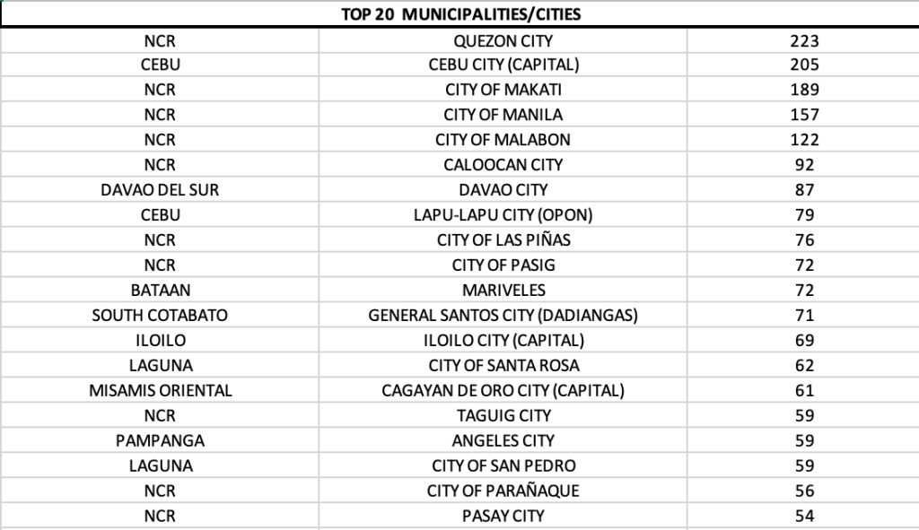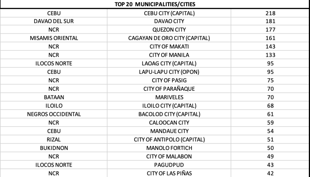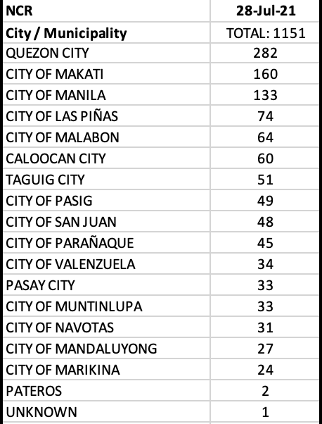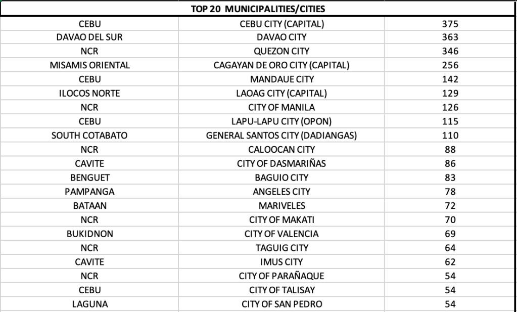 On an LGU level, Quezon City, Cebu City, City of Manila, Davao City and Makati City are the top 5 cities with most cases for the day. Eleven of 17 LGUs in NCR are in the top 20. Three LGUs in Cebu province are also in the top 20.