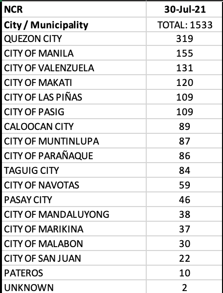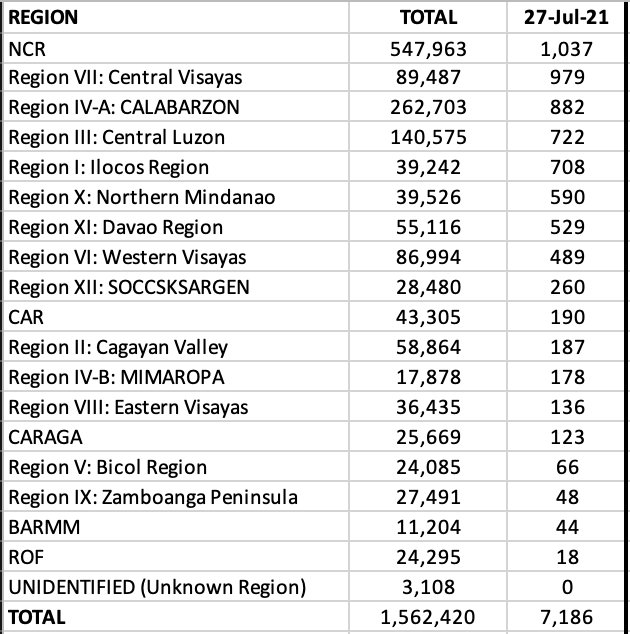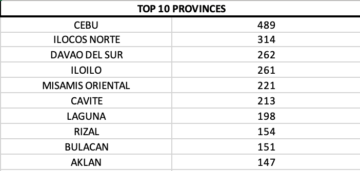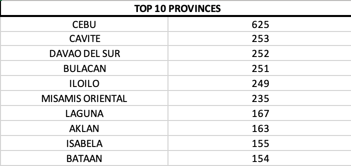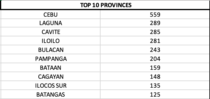 While Cebu province continued to dominate on a provincial level, Cavite, Laguna and Rizal, which make up the chunk of CALABARZON account for more than 1,100 of the 1,392 cases in that region alone.